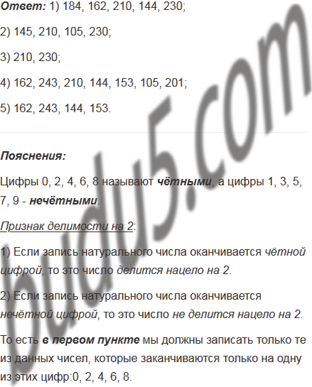 Какие из чисел 184, 162, 243, 145, 210, 144, 153, 105, 230, 201 делится нацело: 1) на 2; 2) на 5; 3) на 10; 4) на 3; 5) на 9?