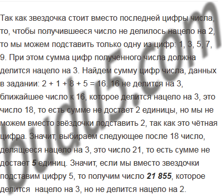 Какую цифру можно поставить вместо звёздочки в записи числа 21 85, чтобы полученное число делилось нацело на 3, но не делилось нацело на 2?