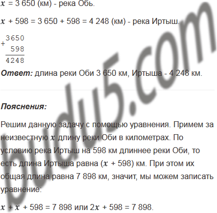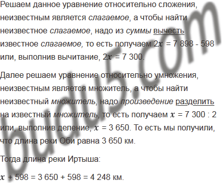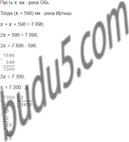 Река Иртыш на 598 км длиннее реки Оби. Найдите длину каждой из этих рек, если их общая длина равна 7 898 км.