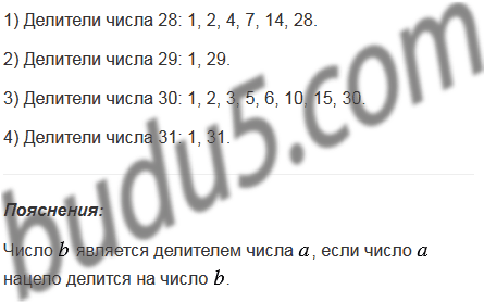 Назовите все делители числа: 1) 28; 2) 29; 3) 30; 4) 31.