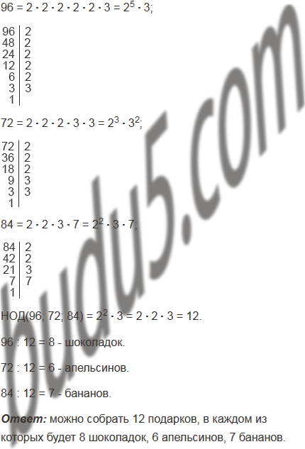 Для новогодних подарков приобрели 96 шоколадок, 72 апельсина и 84 банана. Какое наибольшее количество подарков можно из них составить, если необходимо использовать все продукты? Сколько в отдельности шоколадок, апельсинов и бананов будет в каждом подарке?