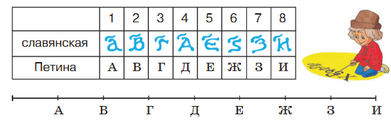 1. В древности на Руси цифрами служили славянские буквы. Петя узнал о славянской нумерации и придумал свою, с русскими буквами. Назови, используя таблицу, буквы, которые соответствовали числам от 1 до 8.