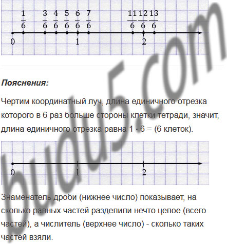 Начертите координатный луч, взяв за единичный такой отрезок, длина которого в 6 раз больше стороны клетки тетради. Отметьте на луче точки, соответствующие числам: