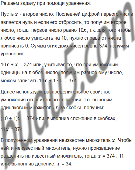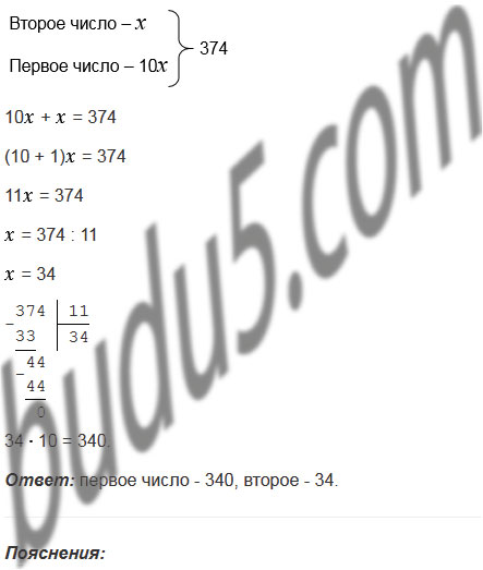 Сумма двух чисел равна 374. Последней цифрой одного из этих чисел является нуль. Если его отбросить, то получим второе число. Найдите эти числа.