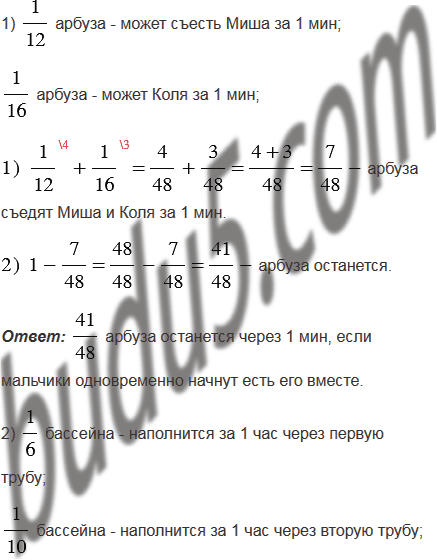 1) Миша может съесть арбуз за 12 мин, а Коля - за 16 мин. Какая часть арбуза останется через 1 мин, если мальчики одновременно начнут есть его вместе?