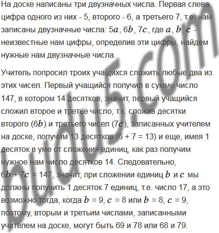 На доске написаны три двузначных числа. Первая слева цифра одного из них - 5, второго - 6, а третьего 7. Учитель попросил троих учащихся сложить любые два из этих чисел. Первый учащийся получил в сумме число 147, второй и третий - разные трехзначные числа, первые слева две цифры которых 1 и 2. Какие числа написаны на доске?
