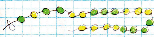 Число бусин каждого цвета увеличивается на 1. Сначала по одной зелёного цвета и одной жёлтого, потом по две, потом по три, потом по четыре.