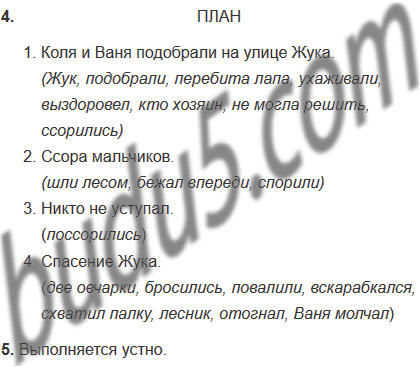 (1) Большую чёрную собаку звали Жук. Коля и Ваня подобрали Жука на улице. У него была перебита лапа. Коля с Ваней ухаживали за ним. Жук выздоровел, и каждому из мальчиков захотелось стать его единственным хозяином. Но кто хозяин Жука, они не могли решить. Мальчики из-за этого часто ссорились.