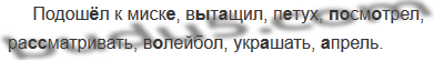 Подош..л к миск.., (вы)т..щил, п..тух, (по)см..трел, ра(с, сс)матривать, в..лейбол, укр..шать, ..прель.