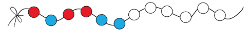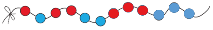 Число бусин каждого цвета увеличивается на 1. Сначала по одной красного цвета и одной синго, потом по две, потом по три, потом по четыре.