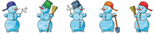 1) Первый снеговик держит в левой руке веточку, смотрит влево, на нём 3 пуговицы и синий ковшик на голове.