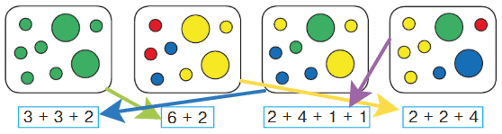3 картинка - 3 жёлтых круга, 3 синих круга и 2 зелёных круга.
