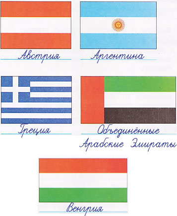 7. С помощью книги "Энциклопедия путешествий. Страны мира" определи, каким странам принадлежат эти флаги. Подпиши названия стран.