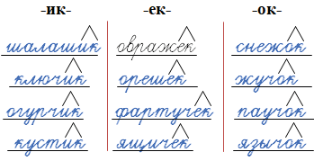 Образуем от данных слов однокоренные при помощи одного из суффиксов: -ик-, -ек-, -ок-. Запишем слова в 3 колонки в зависимости от суффикса в слове. Выделим суффиксы. Объясним написание букв безударных гласных звуков в суффиксах данных слов.