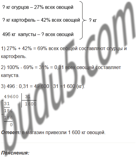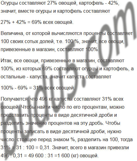 Сколько килограммов овощей привезли в магазин, если огурцы составляют 27% овощей, картофель - 42%, а остальные 496 кг - капуста?
