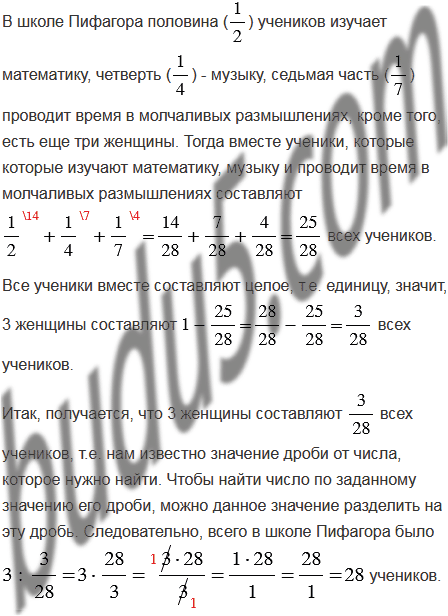 Рассказывают, что на вопрос, сколько учеников в его школе, великий древнегреческий ученый Пифагор ответил: "Половина изучает математику, четверть - музыку, седьмая часть проводит время в молчаливых размышлениях, кроме того, есть еще три женщины." Сколько учеников было в школе Пифагора?