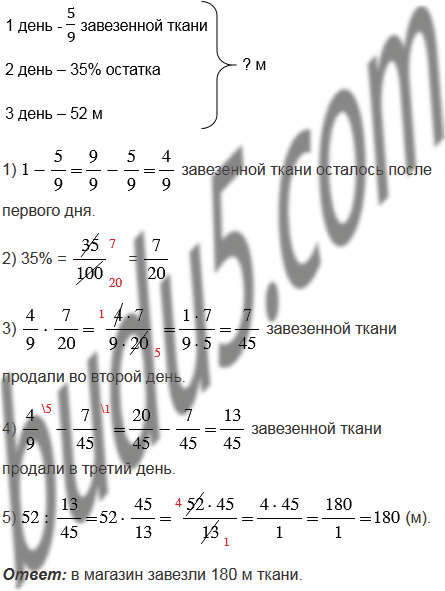 В первый день в магазине продали завезенной ткани, во второй - 35% остатка, а в третий остальные 52 м. Сколько метров ткани завезли в магазин?