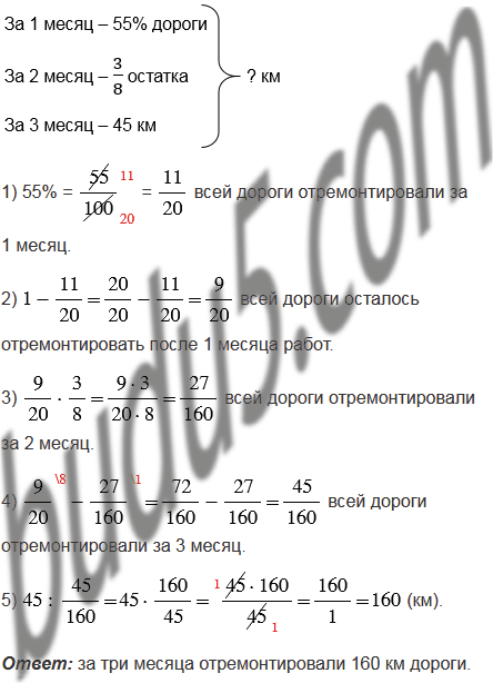 За первый месяц отремонтировали 55% дороги, за второй - остатка, а за третий - остальные 45 км. Сколько километров дороги отремонтировали за три месяца?