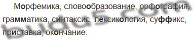 М..рфемика, слово..бразование, орф..графия, гра(м, мм)атика, с..нтаксис, л..ксик..логия, су(ф, фф)икс, пр..ставка, ок..нчание.