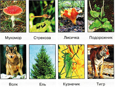 Царство растений: подорожник, ель, мухомор, лисичка.