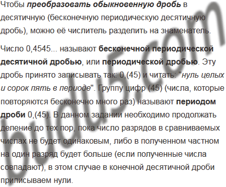 Сравните дроби, записав предварительно обыкновенные дроби в виде конечной десятичной дроби или бесконечной периодической десятичной дроби: