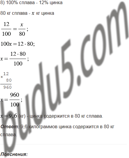 8) Сплав содержит 12% цинка. Сколько килограммов цинка содержится в 80 кг сплава?