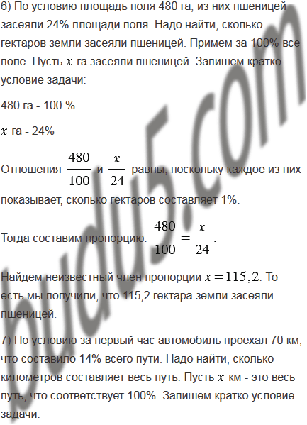 6) Площадь поля 480 га. Пшеницей засеяли 24% площади поля. Сколько гектаров земли засеяли пшеницей?