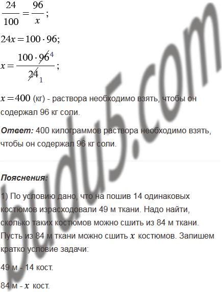 5) Масса соли составляет 24% массы раствора. Сколько килограммов раствора необходимо взять, чтобы он содержал 96 кг соли?