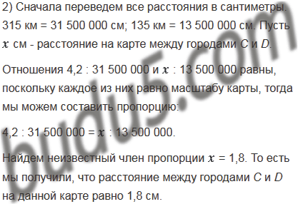 2) Расстояние между городами А и В на местности равно 315 км, а на карте - 4,2 см. Какое расстояние между городами С и D на этой карте, если расстояние на местности между ними составляет 135 км?