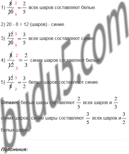 В коробке лежат 20 шаров, из них восемь шаров белые, а остальные - синие. Какую часть всех шаров составляют: 1) белые шары; 2) синие шары? Какую часть количество белых шаров составляет от количества синих? Какую часть количество синих шаров составляет от количества белых?