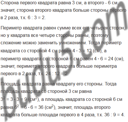 Сторона первого квадрата равна 3 см, а второго - 6 см. Во сколько раз: