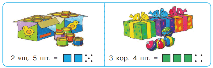 Задание № 1. Сосчитай, сколько коробок и штук, и запиши в таблицы.