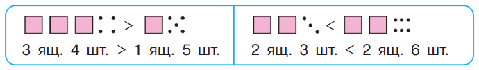 а) как сравнили числа, выраженные в ящиках и штуках: