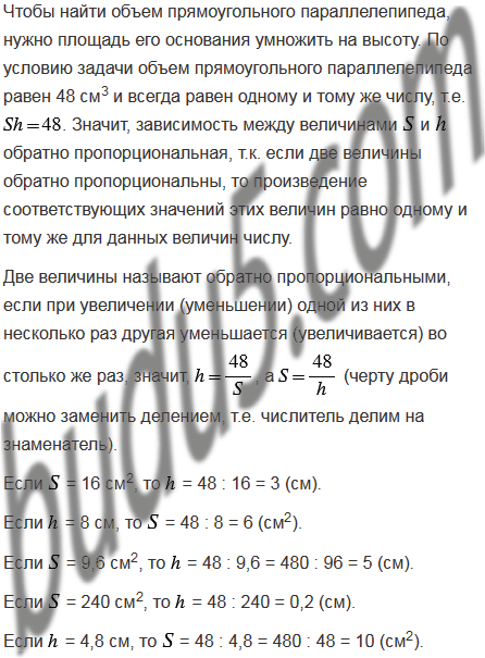 Объем прямоугольного параллелепипеда равен 48 см3. Заполните таблицу, в первой строке которой указана площадь его основания, а во второй - высота.
