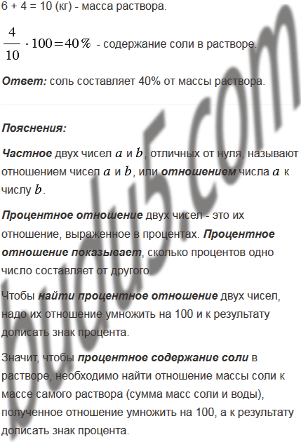 Смешали 6 кг воды и 4 кг соли. Найдите процентное содержание соли в растворе.