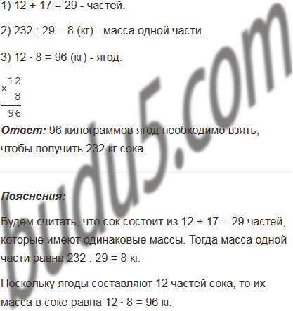 Для изготовления сока берут 12 частей ягод и 17 частей воды (все части имеют одинаковую массу). Сколько килограммов ягод необходимо взять, чтобы получить 232 кг сока?