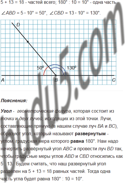 Начертите развёрнутый угол АВС и проведите луч BD так, чтобы градусные меры углов ABD и CBD относились как 5 : 13.