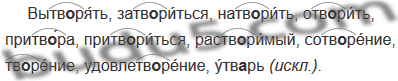 Вытв..рять, затв..риться, натв..рить, отв..рить, притв..ра, притв..риться, раств..римый, сотв..рение, тв..рение, удовлетв..рение, утв..рь.