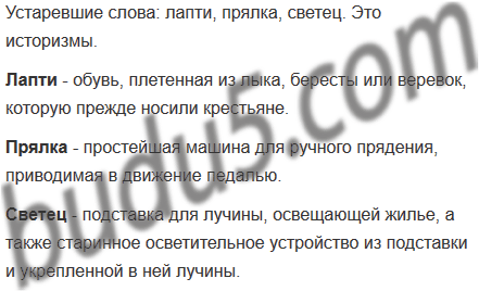 • Попробуйте объяснить значения слов лапти, прялка, светец. Запишите свои ответы в виде словарной статьи и проверьте себя по толковому словарю. Какие это слова – историзмы или архаизмы?
