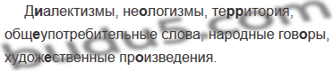 Д..алектизмы, не..логизмы, те(р, рр)итория, общ..употребительные слова, народные гов..ры, худож..ственные пр..изведения.