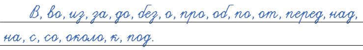 В, во, из, за, до, без, о, про, об, по, от, перед, над, на, с, со, около, к, под.