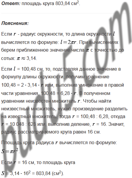 Длина окружности равна 100,48 см. Найдите площадь круга, ограниченного этой окружностью.
