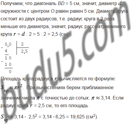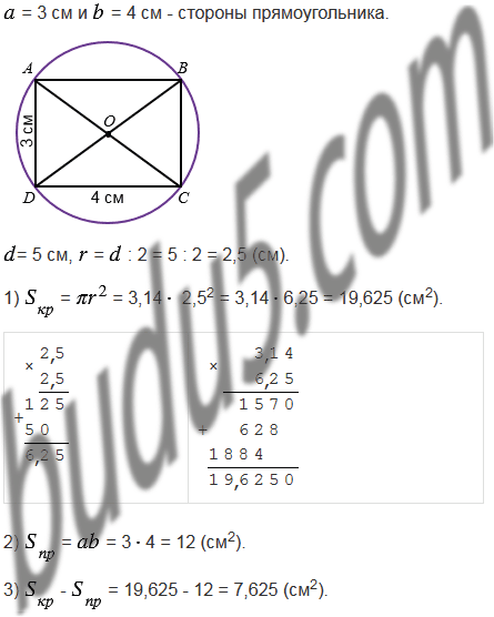 Начертите прямоугольник со сторонами 3 см и 4 см. Проведите диагонали прямоугольника. Приняв точку пересечения диагоналей за центр окружности, а половину диагонали - за радиус, проведите эту окружность. Измерьте линейкой диаметр полученной окружности (в сантиметрах с точностью до единиц). На сколько квадратных сантиметров площадь круга, ограниченного этой окружностью, больше площади прямоугольника?