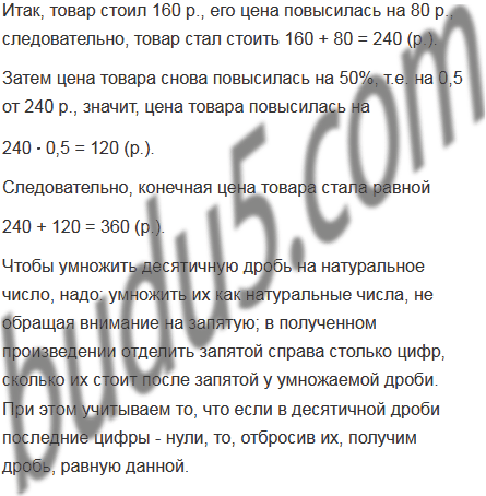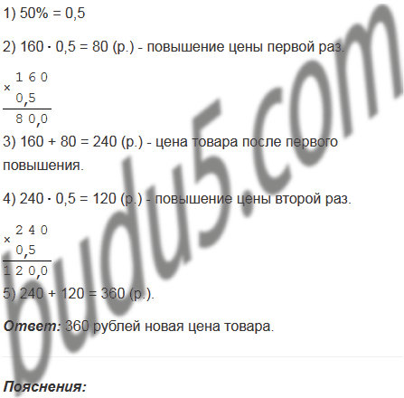 Цена товара дважды повышалась и каждый раз на 50%. Какой стала цена товара, если сначала она составляла 160 р.?