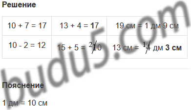 | 10 + 7 = 17 | 13 + 4 = 7 | 19 см = 1 дм 9 см |