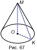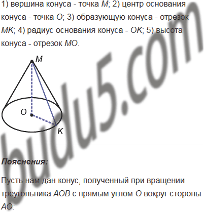 На рисунке 67 изображён конус. Укажите: 1) вершину конуса; 2) центр его основания; 3) образующую конуса; 4) радиус основания конуса; 5) высоту конуса.