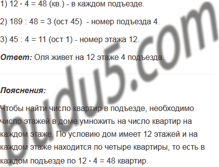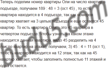 Оля живёт в двенадцатиэтажном доме в квартире N189. В каком подъезде и на каком этаже живёт Оля, если в её доме на каждом этаже находится по четыре квартиры?