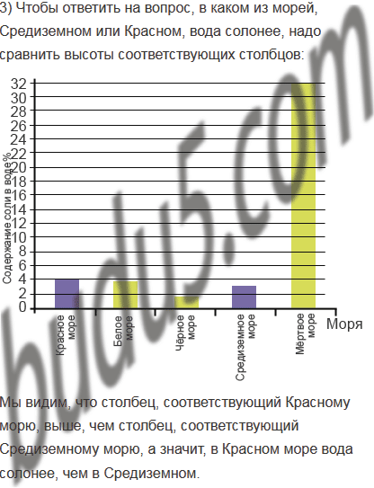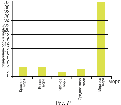 Пользуясь диаграммой, на которой изображено процентное содержание соли в воде некоторых морей (рис. 74), установите: