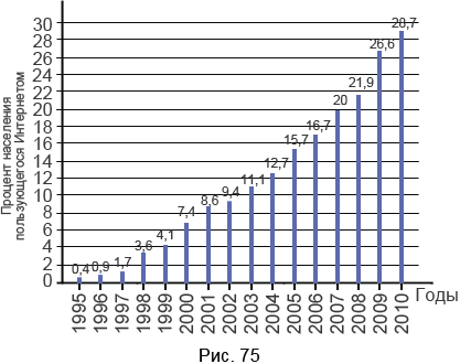 На рисунке 75 приведена диаграмма количества пользователей Интернета в мире в процентах по отношению к общему количеству населения с 1995 по 2010 г. В течении какого года произошёл наименьший прирост количества пользователей? Наибольший прирост?