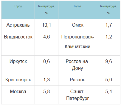 Пользуясь таблицей средних годовых температур воздуха в отдельных городах России, постройте соответствующую столбчатую диаграмму.